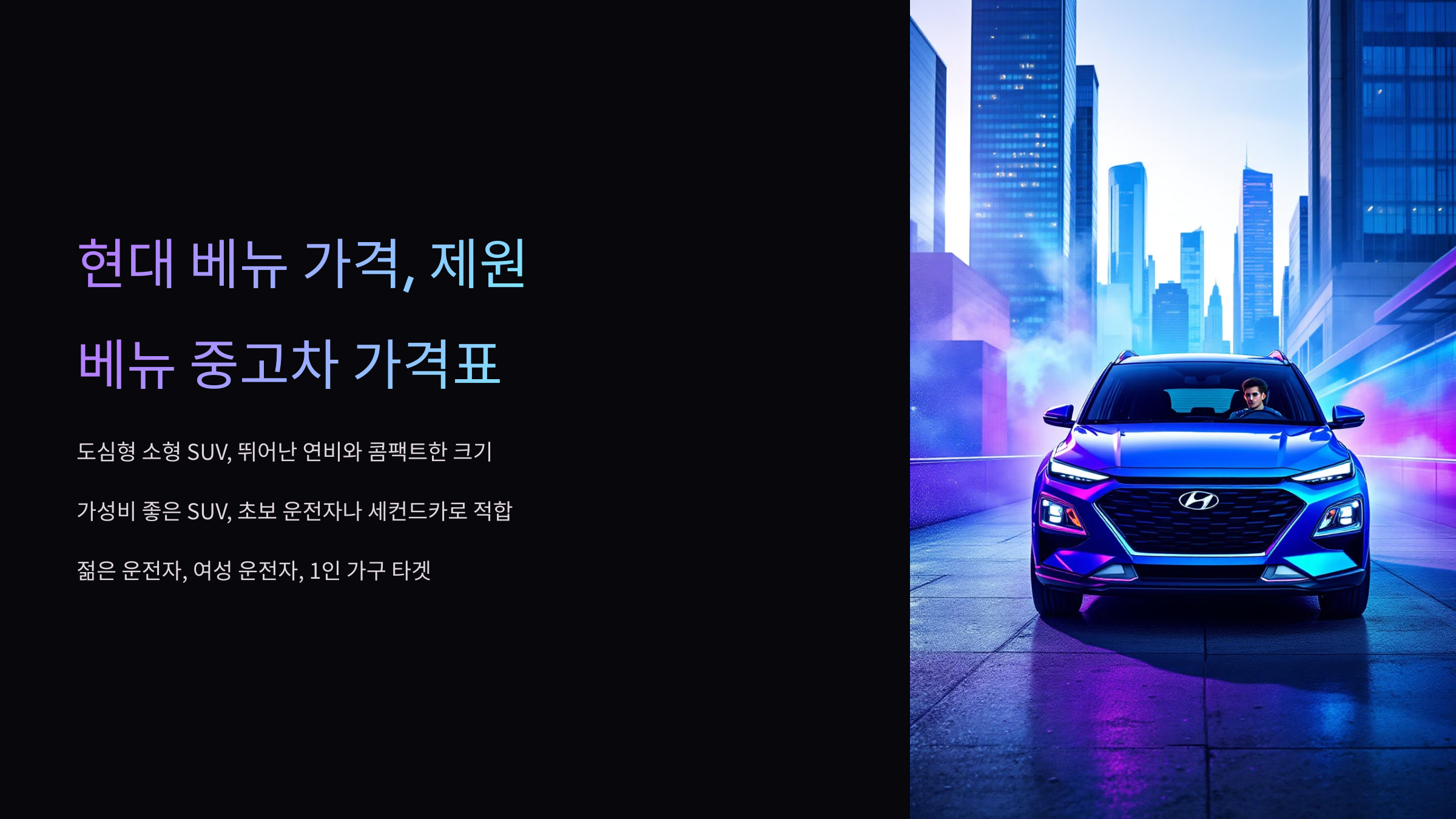 현대 베뉴는 도심형 소형 SUV로, 뛰어난 연비와 콤팩트한 크기로 많은 운전자들에게 사랑받고 있는 차량입니다. 가성비 좋은 SUV를 찾는 분들에게 적합한 모델이며, 초보 운전자나 세컨드카를 원하는 사람들에게도 추천되는 차량입니다. 소형 SUV 시장에서 젊은 운전자, 여성 운전자, 1인 가구 등을 대상으로 인기를 끌고 있으며, 상대적으로 저렴한 유지비와 경제적인 연비로 높은 만족도를 제공합니다.