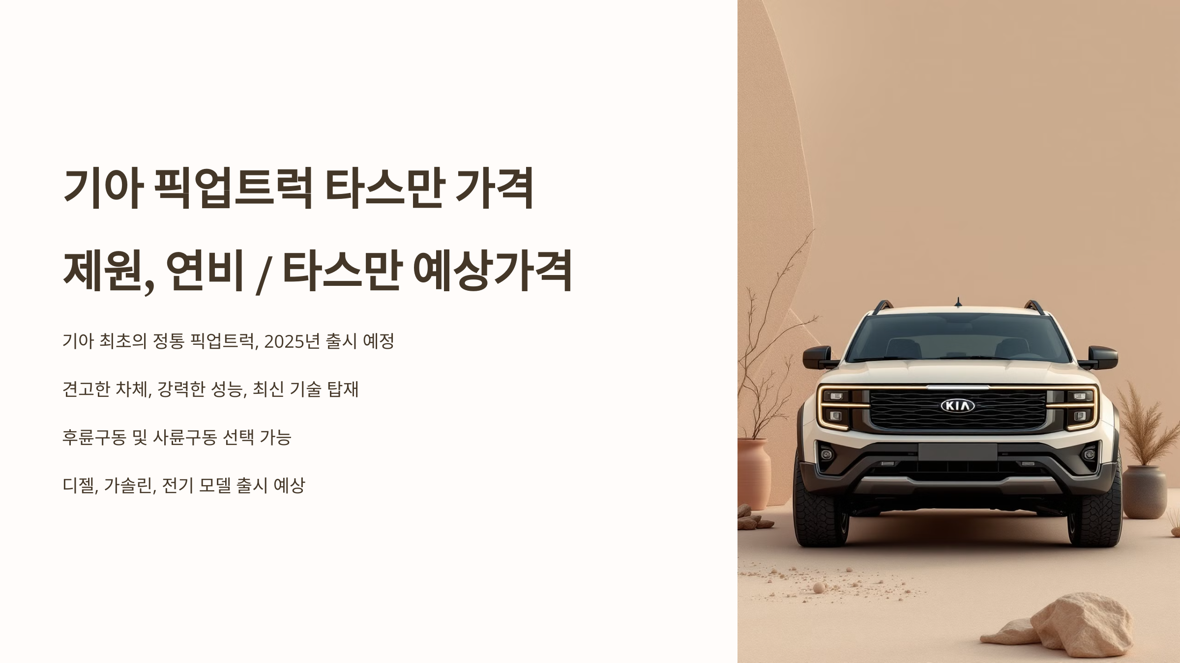 📌 기아 타스만은 강력한 오프로드 주행 성능과 넉넉한 적재 공간을 갖춘 정통 픽업트럭으로, 국내 시장에서 새로운 트렌드를 이끌어 갈 모델입니다.
