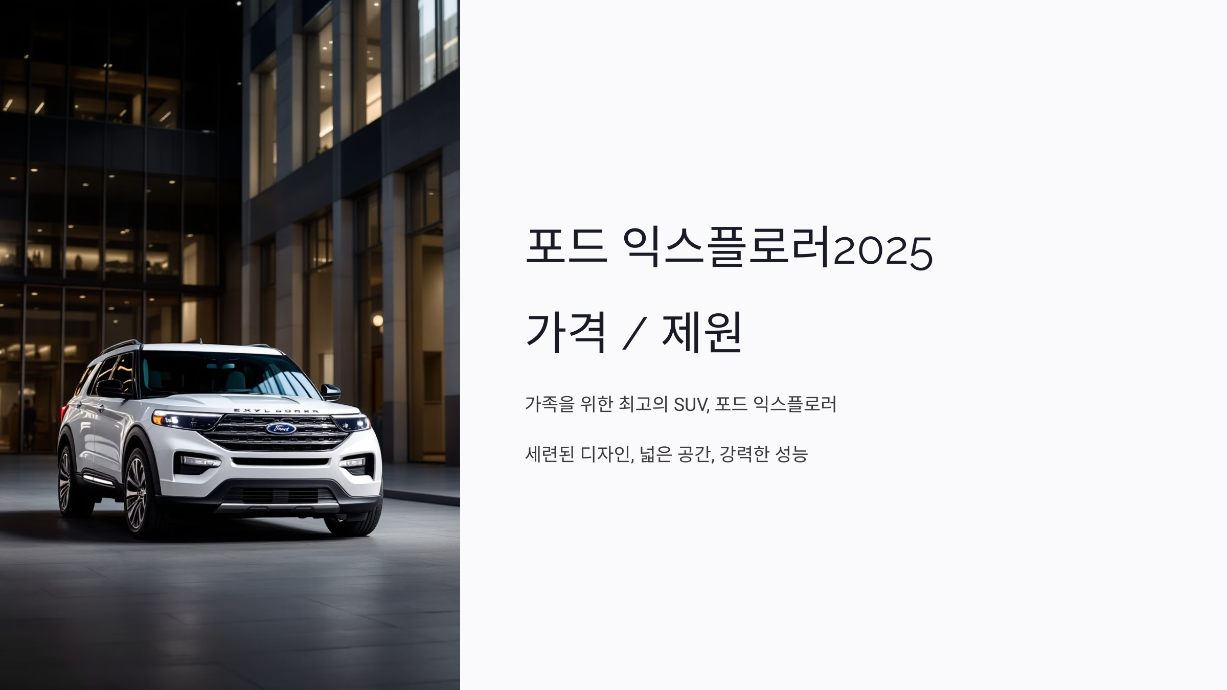 가족을 위한 최고의 SUV를 찾고 계신가요? 포드 익스플로러는 넓은 공간, 강력한 성능, 그리고 다양한 편의 기능으로 오랫동안 사랑받아온 모델입니다. 2025년형으로 새롭게 출시된 포드 익스플로러의 가격과 제원은 어떻게 달라졌을까요? 전문가의 시각으로 2025년형 포드 익스플로러의 모든 것을 자세히 살펴보겠습니다.