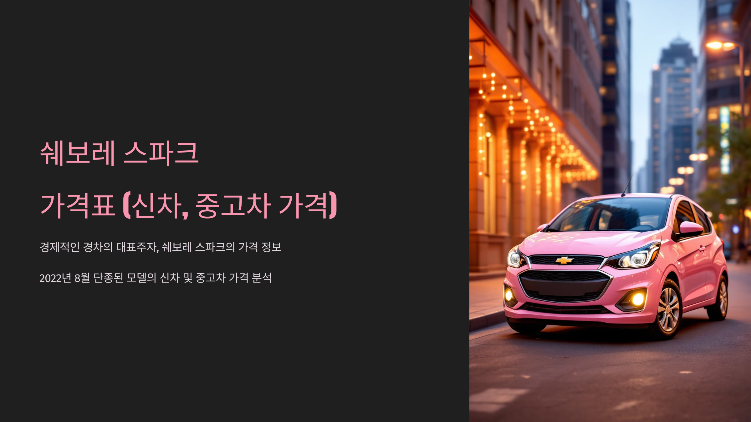 경차 시장의 스테디셀러, 쉐보레 스파크의 가격 정보를 찾는 모든 분들을 위해 준비했습니다. 신차는 이제 더 이상 만날 수 없지만, 중고차 시장에서 여전히 활발하게 거래되는 쉐보레 스파크의 매력적인 가격대와 구매 팁까지, 전문가의 시각으로 속속들이 분석해 드리겠습니다. 스파크 구매를 고려 중이라면, 이 글 하나로 모든 궁금증을 해결해 보세요!