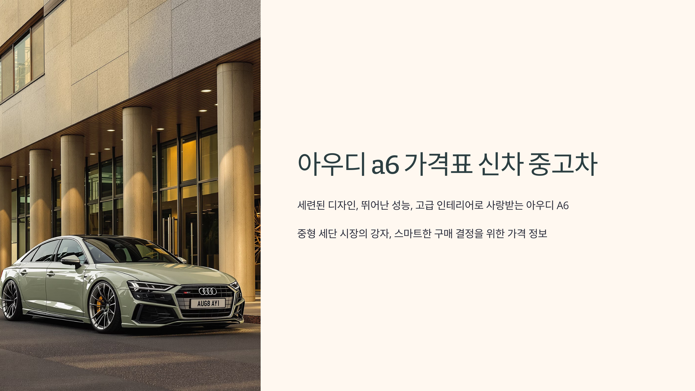 세련된 디자인, 뛰어난 성능, 그리고 고급스러운 실내 인테리어로 많은 사랑을 받는 아우디 A6. 중형 세단 시장에서 강력한 존재감을 드러내는 모델입니다. 아우디 A6 구매를 고려하고 계신가요? 신차 가격은 물론, 합리적인 선택이 될 수 있는 중고차 가격까지, 아우디 A6의 모든 가격 정보를 총정리했습니다. 지금부터 아우디 A6의 가격표를 낱낱이 파헤쳐보고, 여러분의 스마트한 구매 결정을 돕겠습니다.