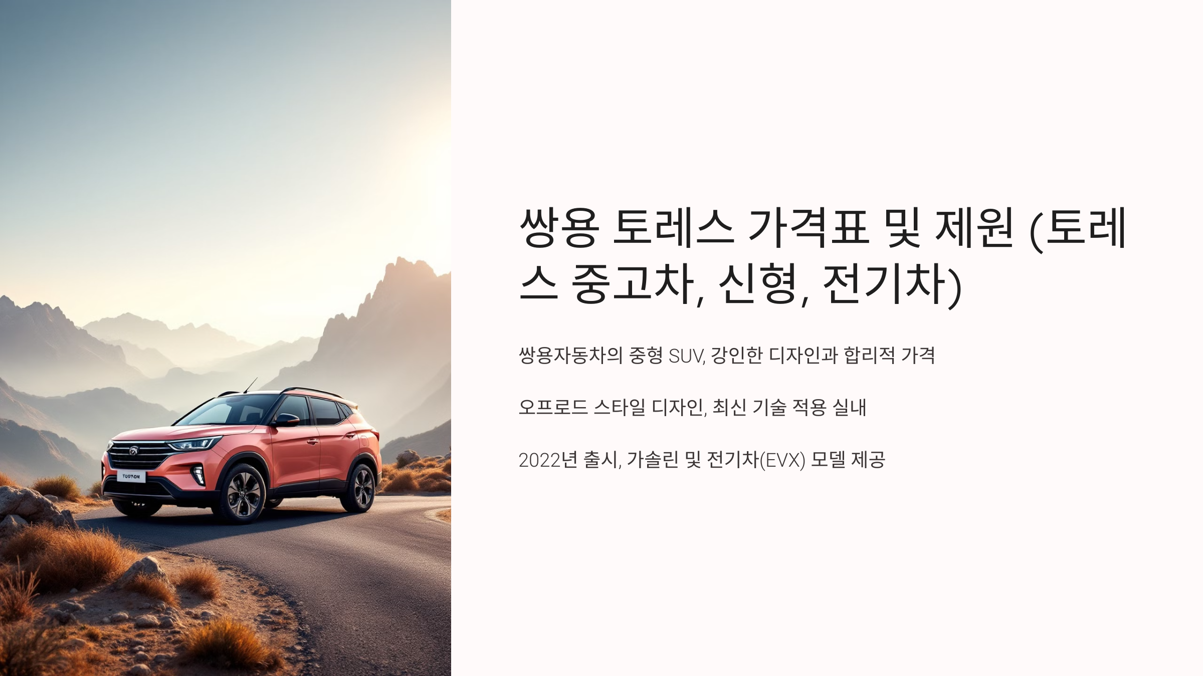 이 글에서는 **쌍용 토레스의 가격표, 제원, 신형 모델, 중고차 시세, 전기차 모델(EVX)**까지 자세히 알아보겠습니다.